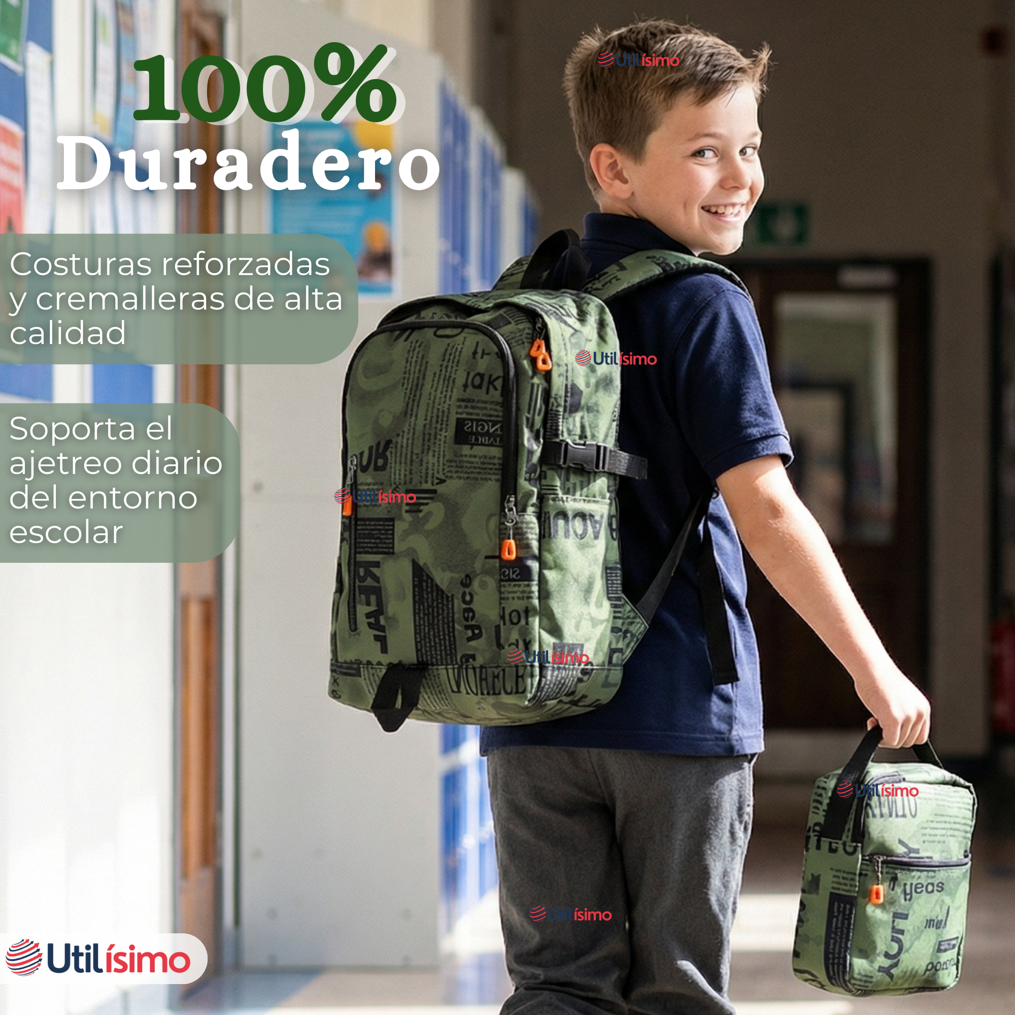 Mochila Escolar + Estuche + Lonchera 49cm Tela Oxford Verde Militar Niño