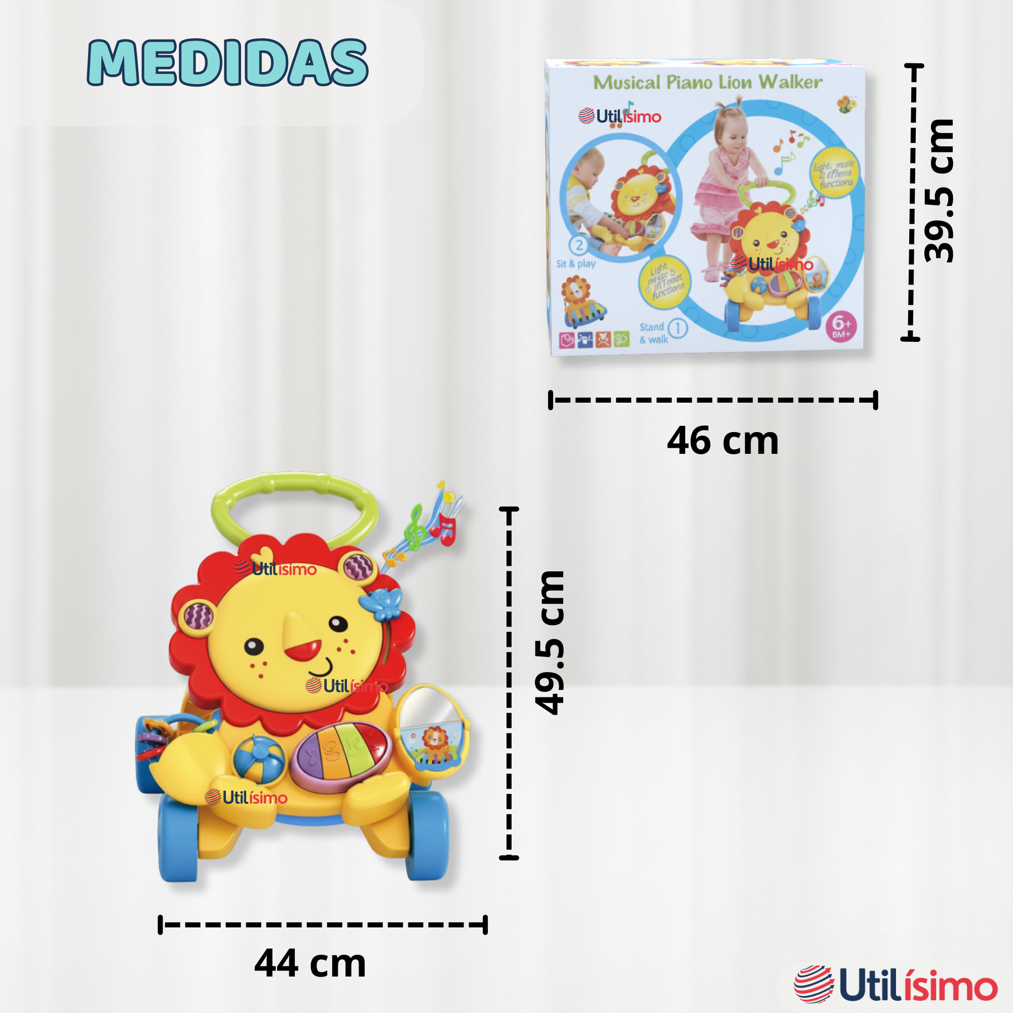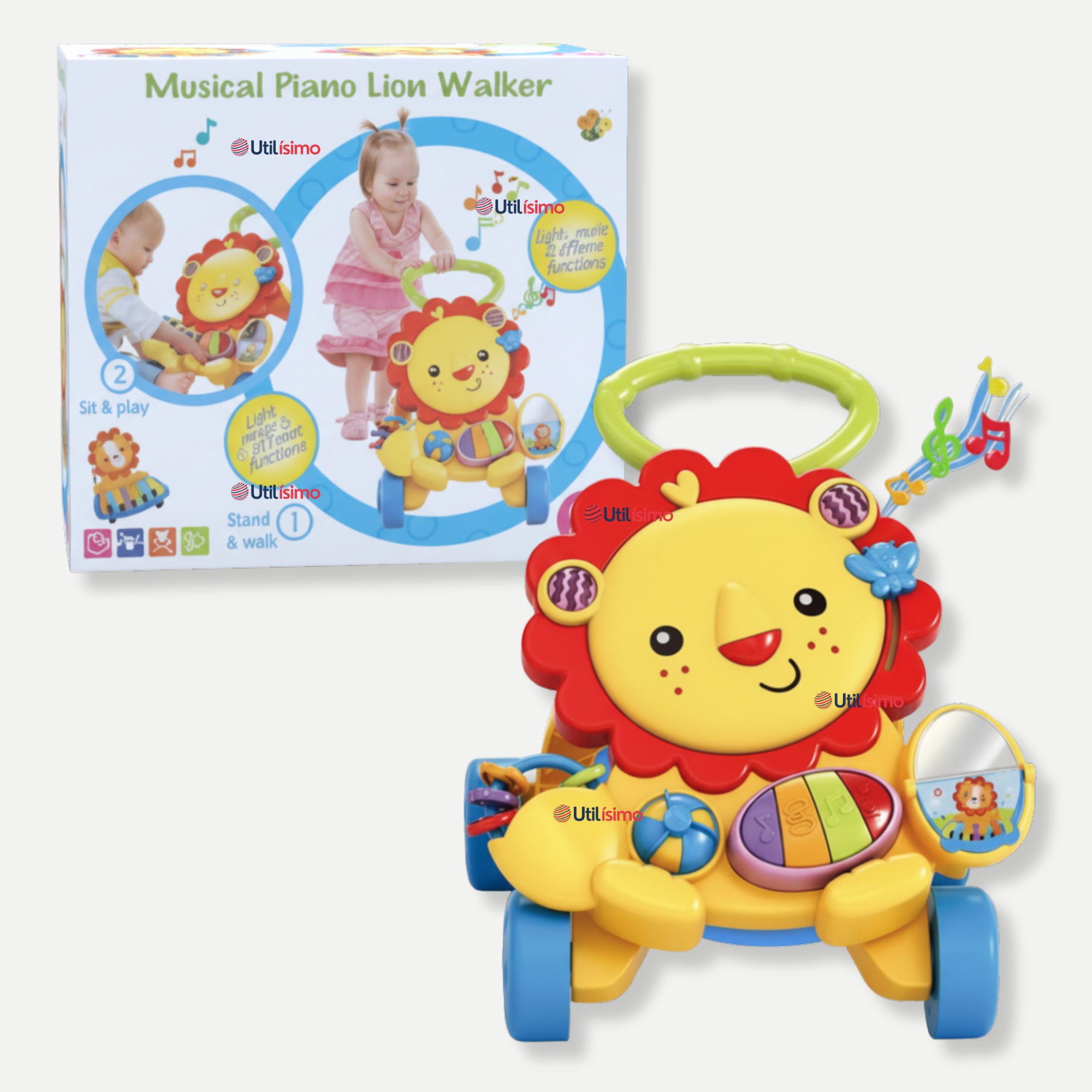 - Modo de uso: Para jugar sentado con el piano y botones interactivo, además funciona como andador con ruedas y asa ergonómica para apoyar los primeros pasos.