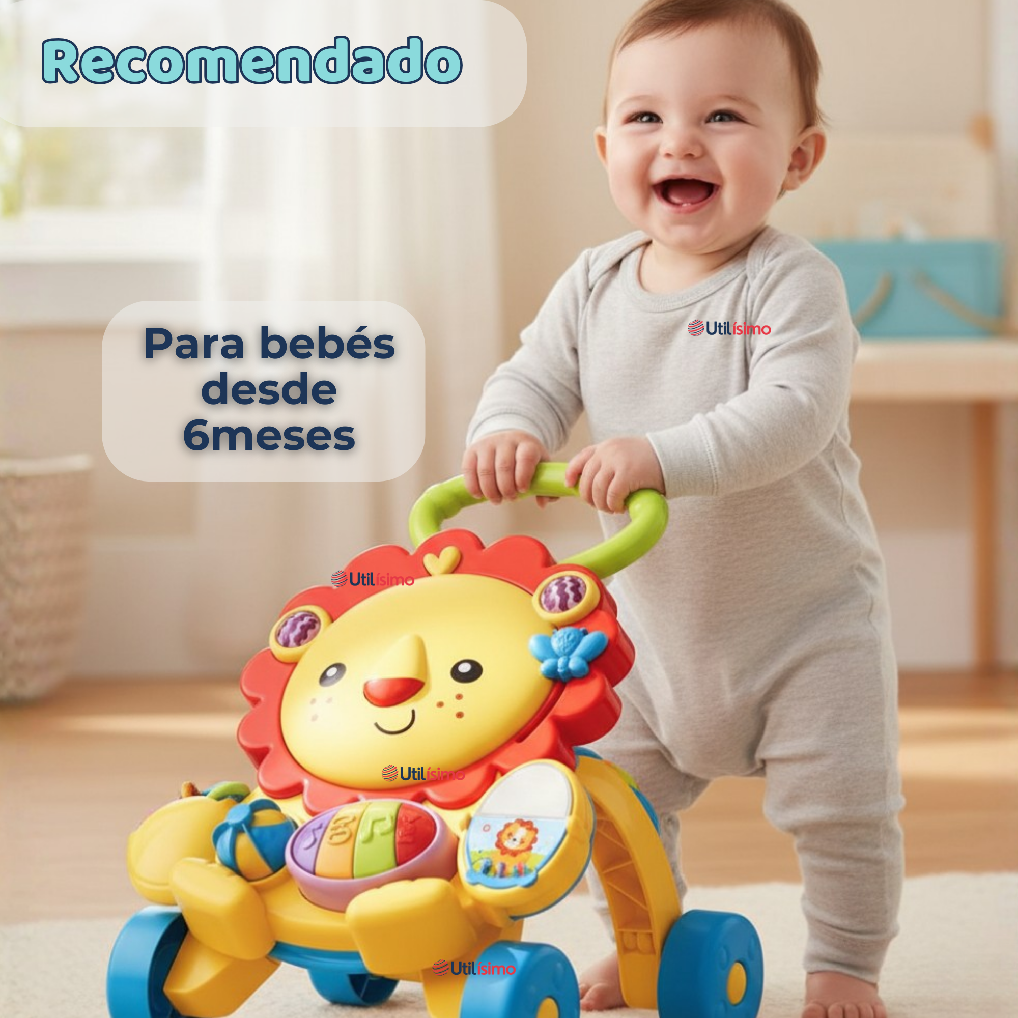 Este andador multifuncional está diseñado para acompañar el desarrollo temprano de bebés desde los 6 meses. Con forma de león y múltiples actividades sensoriales, promueve el juego sentado, los primeros pasos y el aprendizaje musical de forma divertida y segura.