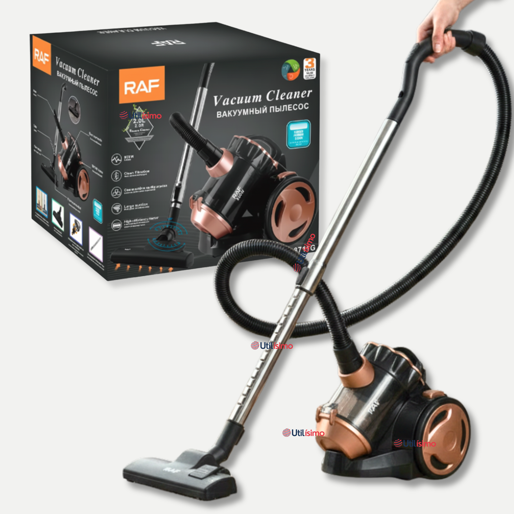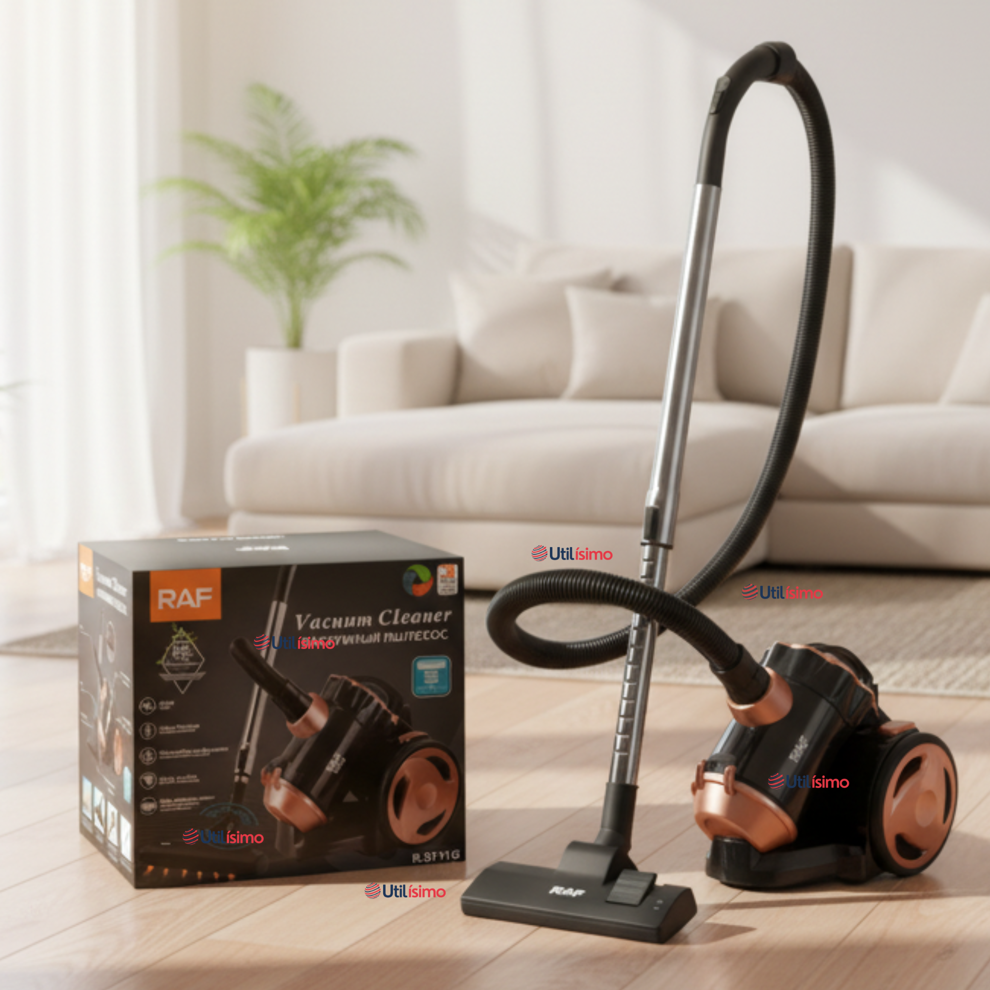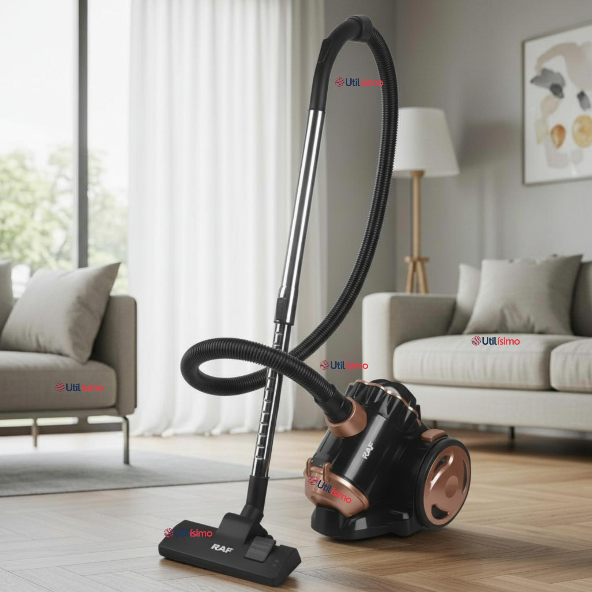 La Aspiradora es un electrodoméstico de limpieza moderno y compacto, diseñado con un estilo elegante en colores negro y detalles en oro rosa (cobre). Es una aspiradora de tipo trineo (canister) sin bolsa, que utiliza tecnología ciclónica para separar el polvo del aire. Destaca por ser una máquina "2 en 1", ofreciendo funciones tanto de aspirado como de soplado, ideal para la limpieza profunda de hogares y oficinas.
